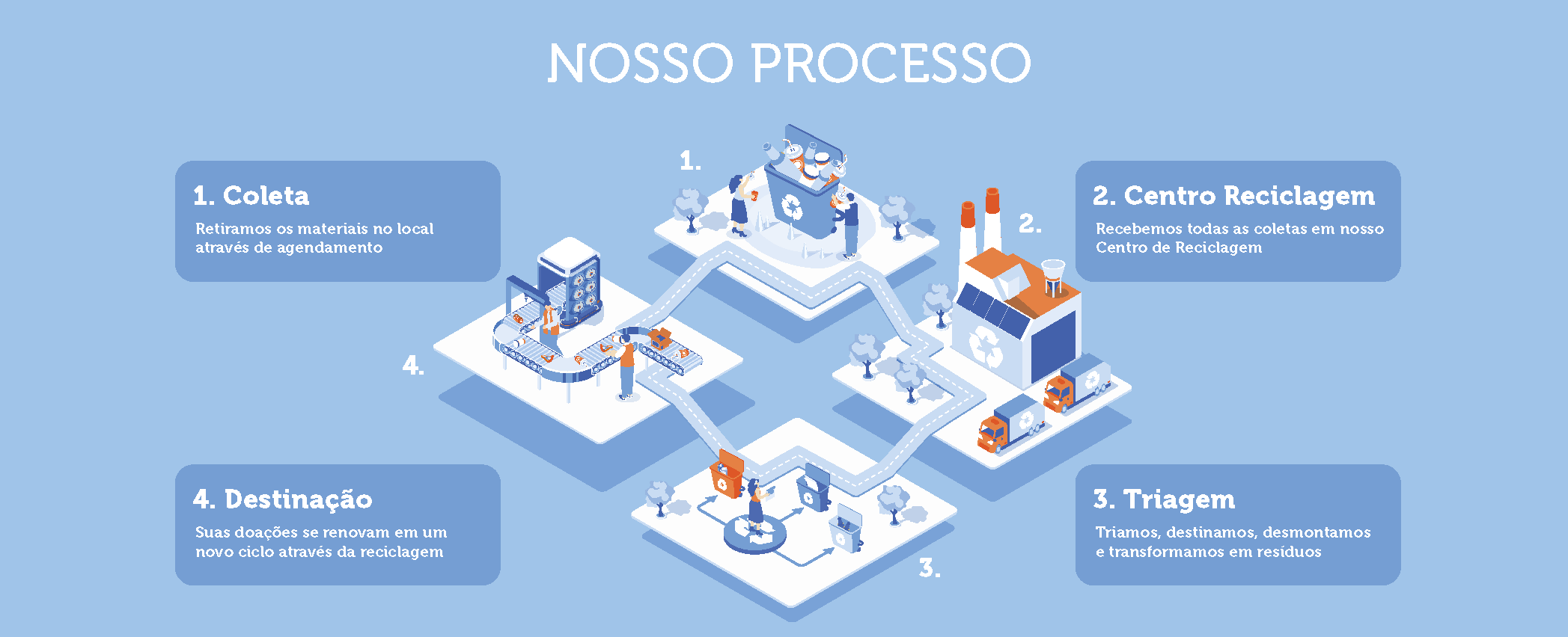 Nós gerenciamos os resíduos eletrônicos com o objetivo de assegurar que todos os equipamentos coletados sejam aproveitados, reintegrados ao ciclo produtivo e ao reúso, tanto internamente quanto em parceria com outras organizações. Adotamos uma abordagem profissional, com coletas programadas e envio semanal dos resíduos para o processamento e destinação final adequada. Em nosso processo, nos orgulhamos de minimizar o desperdício ao máximo.